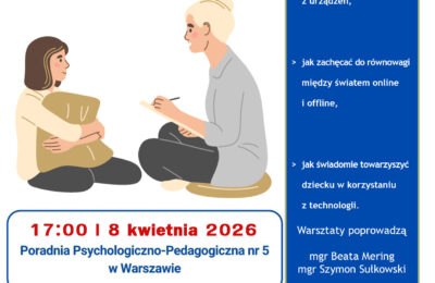 Zapraszamy rodziców na kolejny praktyczny warsztat, podczas którego pokażemy, jak mądrze towarzyszyć dziecku w świecie technologii. Dowiesz się m.in.: – jak wprowadzać czytelne zasady korzystania z urządzeń, – jak wspierać równowagę między światem online i offline, – jak świadomie towarzyszyć dziecku w kontakcie z technologią.
