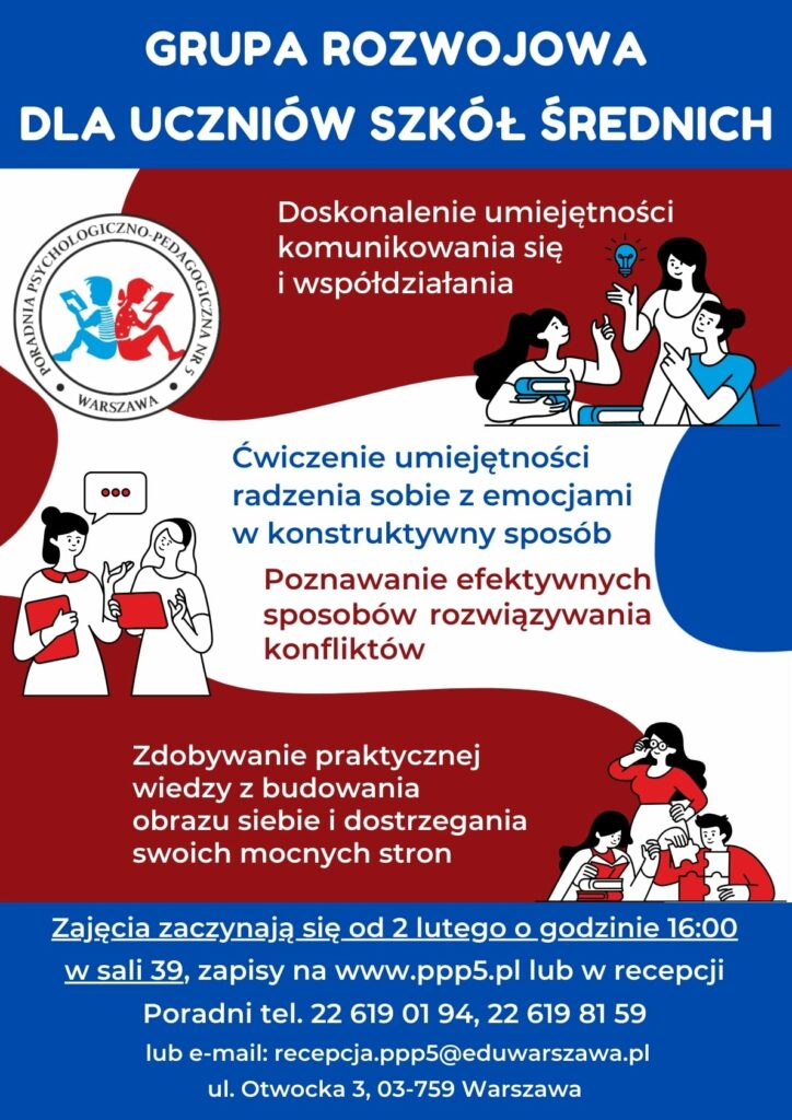 Pierwsze zajęcia odbędą się 02.02.2024 r. (poniedziałek) o godzinie 16:00 w sali 39 w Poradni Psychologiczno-Pedagogicznej Nr 5 na ulicy Otwockiej 3 w Warszawie.