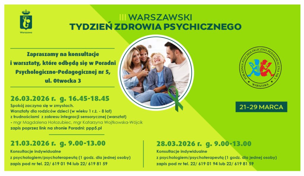 zapraszamy do skorzystania z konsultacji i warsztatu w naszej Poradni w ramach Warszawskiego Tygodnia Zdrowia Psychicznego.